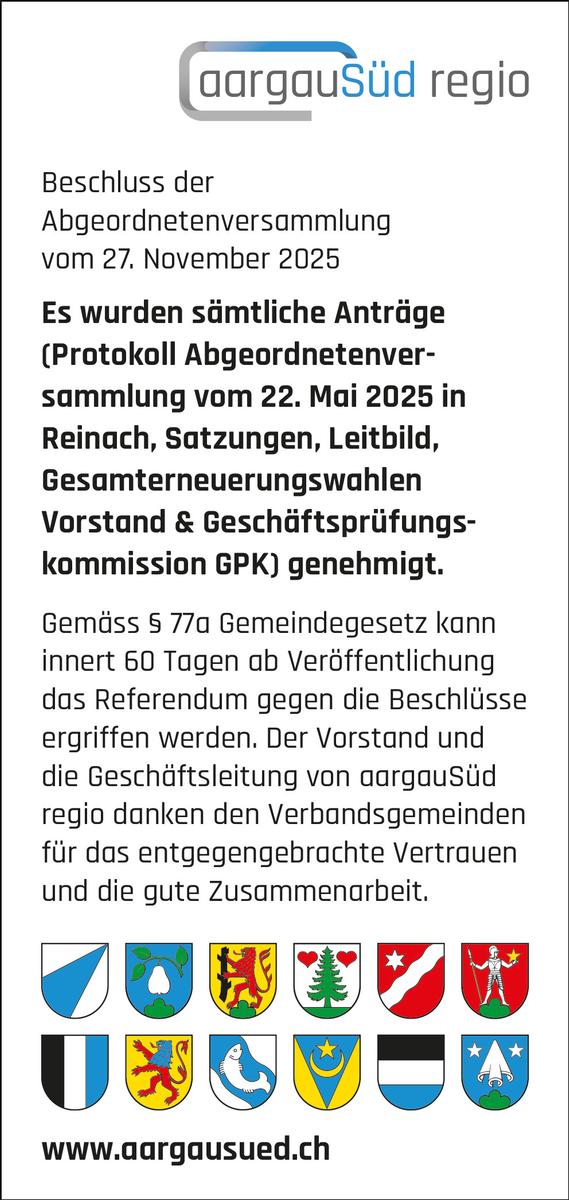 NewsBeschlüsse Abgeordnetenversammlung, 27. November 2025 in TeufenthalSämtliche Beschlüsse wurden genehmigtAlle Verbandsgemeinden waren anwesend – hier gehts zum Protokoll.